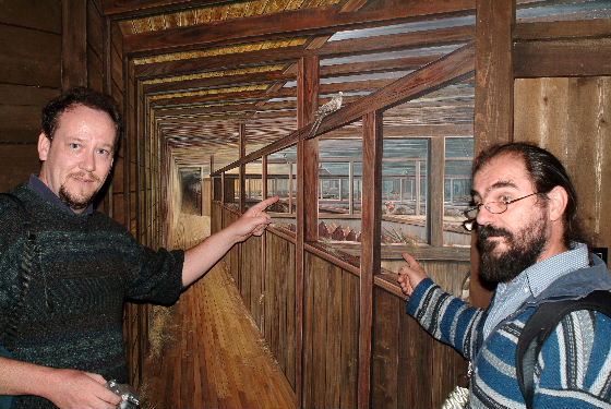 Here Stephen and Ian play tour guide on the good ship “Ark”. Stephen notes part of a dinosaur visible in the background, and Ian draws our attention to the stegosaur bedded down in its stall.
