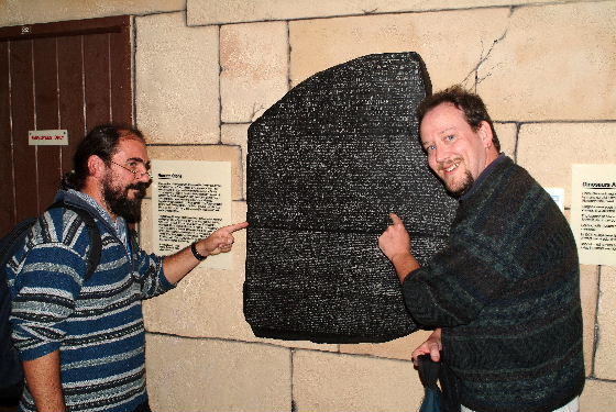 • Just got back a couple weeks ago from the British Museum, home of the actual Rosetta Stone. If your benighted correspondant should ever go there, I hope they notice that there are actually 2 stones, the real one (under glass) and a full size facsimilie, which allows close-up inspection.