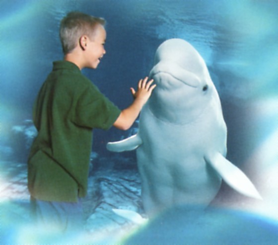 Back in 2005, I attended a part of the Kitzmiller v. Dover Area School district trial. On the flight to Harrisburg, PA, the airline provided a “snack” — the usual pitiful collection of empty calories. And apparently even that was subsidized by advertising. My box had advertising by Sea World all over it. But I recognized a face on the box as an old friend of mine — no, not the kid, I don’t know him from anyone, but the white whale (Delphinapterous leucas) in the picture below taken from that snackbox is “Muk-Tuk”.