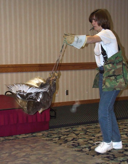 It’s the 2001 California Hawking Club annual meet, and one of the evening sessions featured a demonstration of restrained flight to food for purposes of keeping muscle mass and tone. Jamaica Smith chose to demonstrate this with her ferruginous hawk. The systematists are having an extended argument over whether the species is a large buteoine hawk or a small eagle. It’s still a lot of bird any way that gets resolved, and it really, really wanted the bit of rabbit on the floor. It’s likely that by poundage this exercise program bulked up Jamaica more than her bird. We were impressed, sitting there in the front row and having a bit of breeze from the the wingbeats.