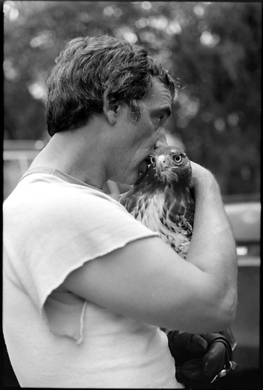 Jerry Hollifield and his hen red-tailed hawk, Bee. What you don’t see in this photo is the pair of small circular scars on Jerry’s left forearm, about midway, one on top and the other on the bottom, where Bee had settled with one talon off Jerry’s glove when someone startled her into clenching, putting that talon all the way through his arm.