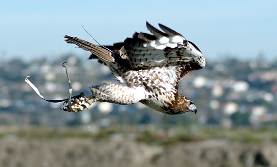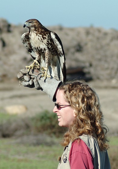 Back in 2002, Diane’s apprentice Andrea was getting her passage tiercel red-tailed hawk, Lavan, trained. Part of that involved free-flying Lavan to bagged game. These are two pictures from one of those outings.