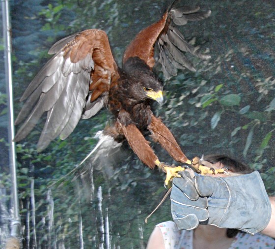Shelby comes to the glove. Notice that his feet have not quite made contact. Also, you can see from the photo that he has very long legs. It is hard to appreciate just how long a reach a Harris’s hawk has from looking at it perched somewhere. Another thing you can see is that Shelby is in the midst of molting, especially in looking at the feathers of his left wing, where there are some gaps where the old feathers have dropped out, but the new feathers have not yet grown in.